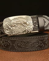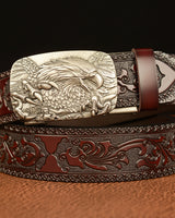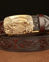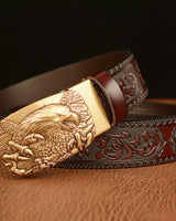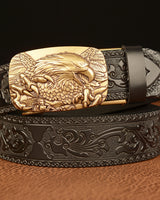 Deze Gespero riem met goudkleurige adelaarsbuckle combineert elegantie met functionaliteit voor een unieke stijl. De riem is vervaardigd uit hoogwaardig materiaal met een gedetailleerd reliëfpatroon dat direct de aandacht trekt. De opvallende goudkleurige gesp met adelaar voegt een krachtig en onderscheidend accent toe aan elke outfit, perfect voor de man die een statement wil maken.